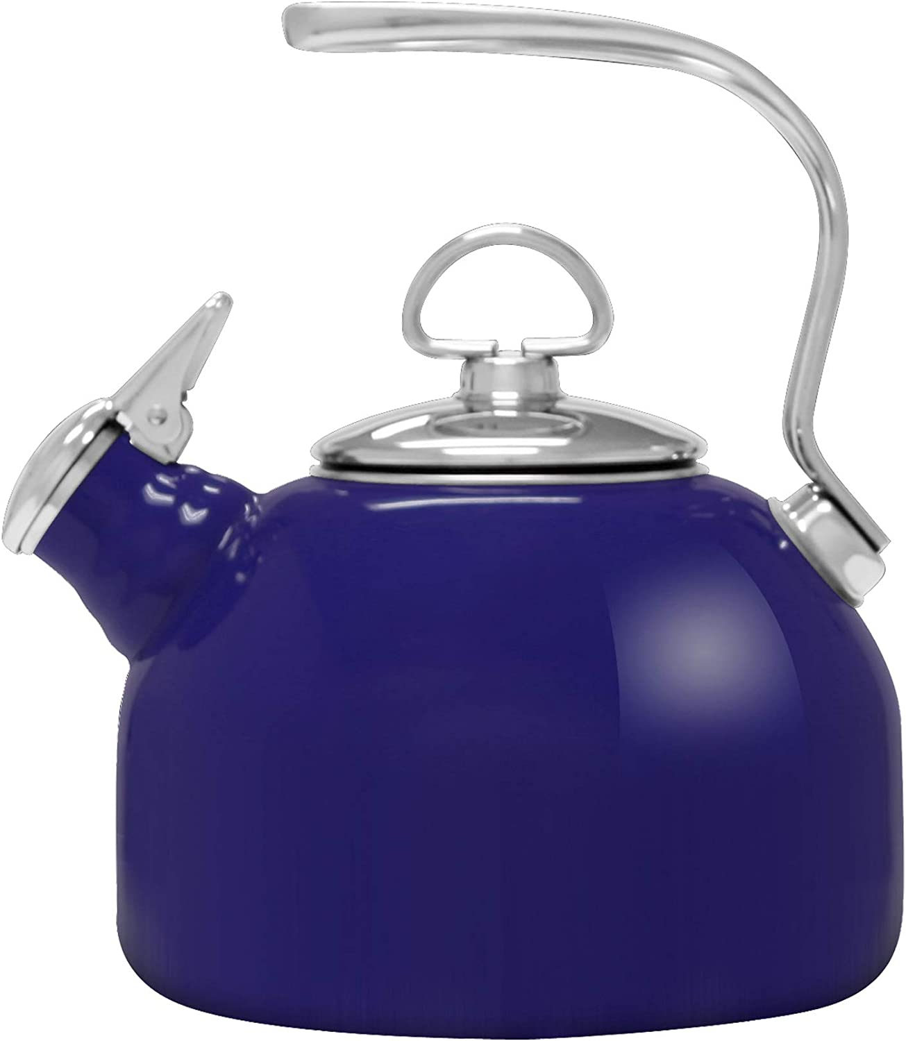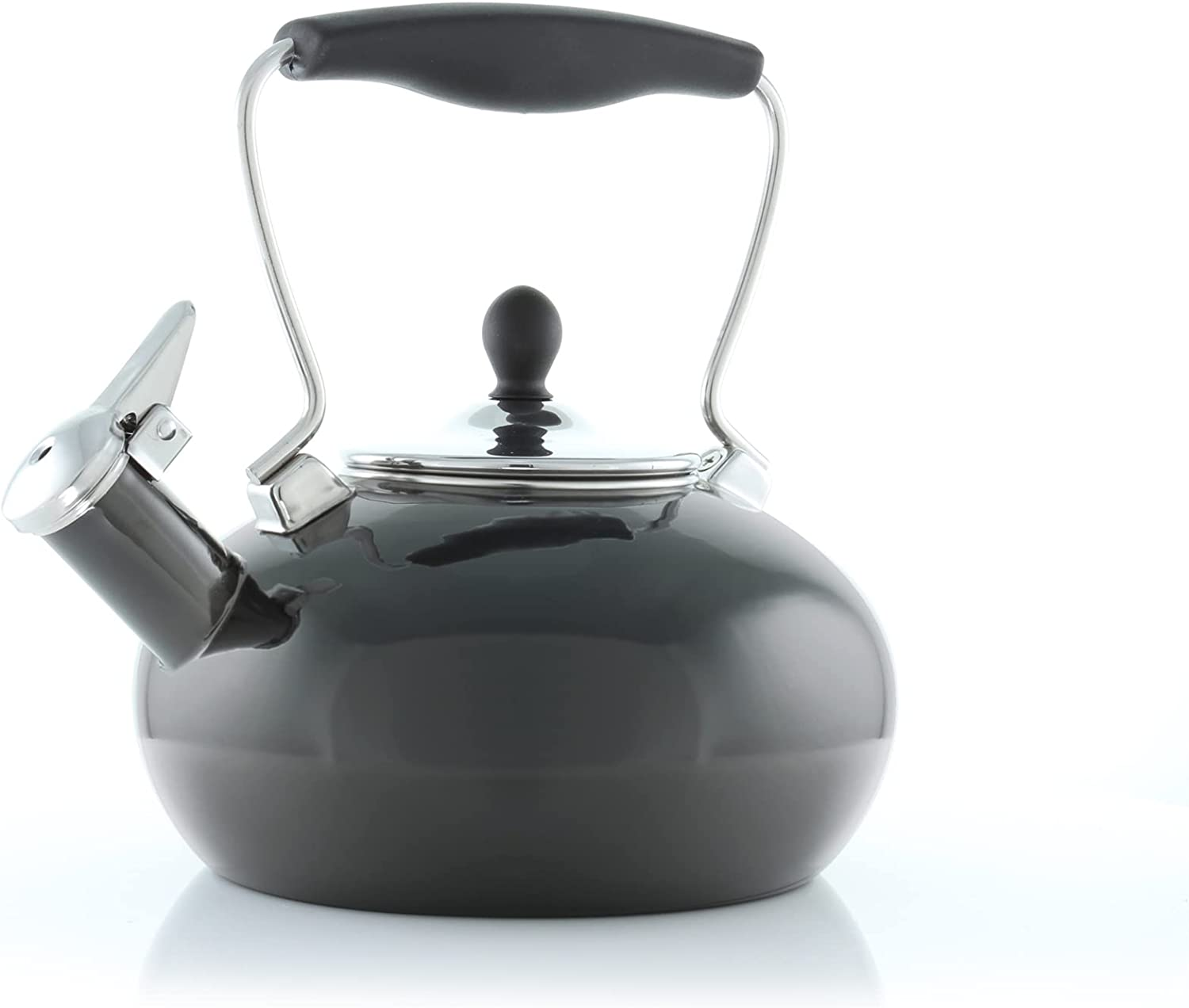 Chantal tea kettles are made of enamel-coated steel and come in a variety of colors. They are ergonomically designed with a comfortable grip and a stay-cool handle, and they whistle when the water reaches a boil. Chantal tea kettles are also dishwasher-safe.