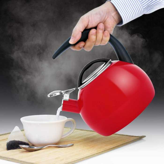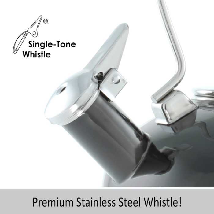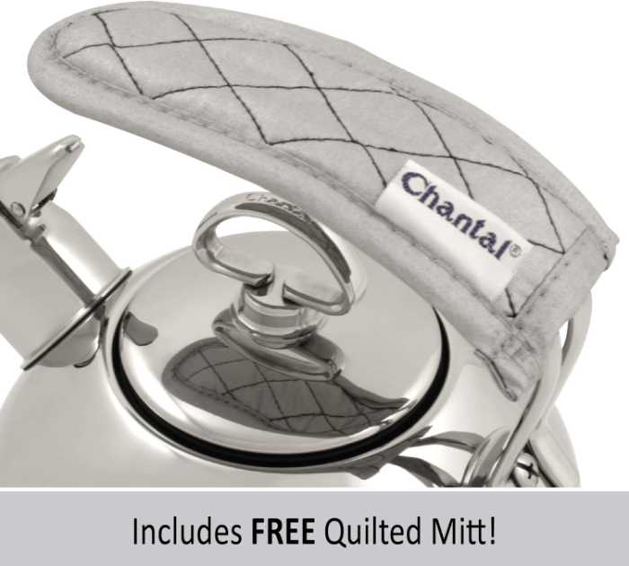 While traditional whistling kettles can often become too hot to touch, this kettle features a cool-touch handle for added safety and convenience and includes free quilted mitt for your convenience.